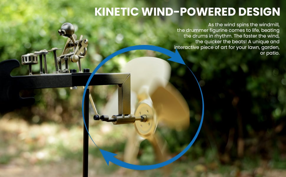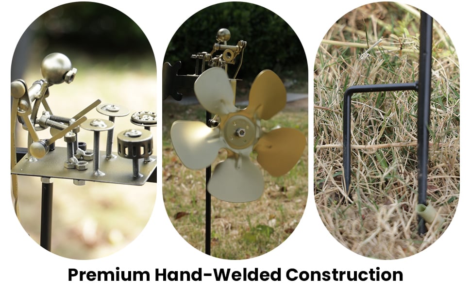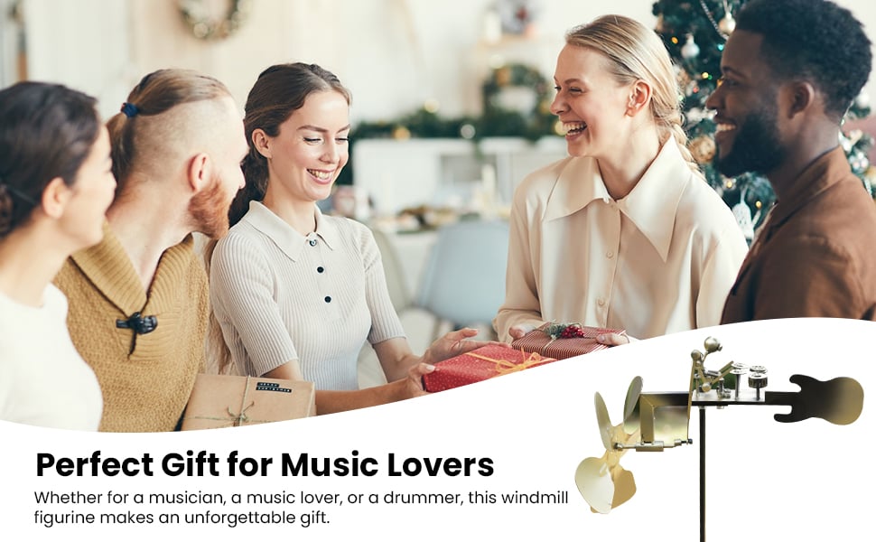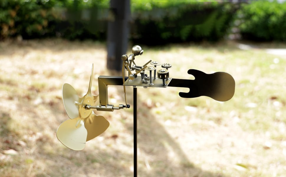 Our Handmade Metal Drummer Windmill is fully hand-welded and crafted with care. As the wind turns the windmill at the back, it drives the drummer to play the drum — the stronger the wind, the faster the beats. We've also replaced the traditional front-facing arrow with a unique guitar-shaped design, adding a fun musical twist.